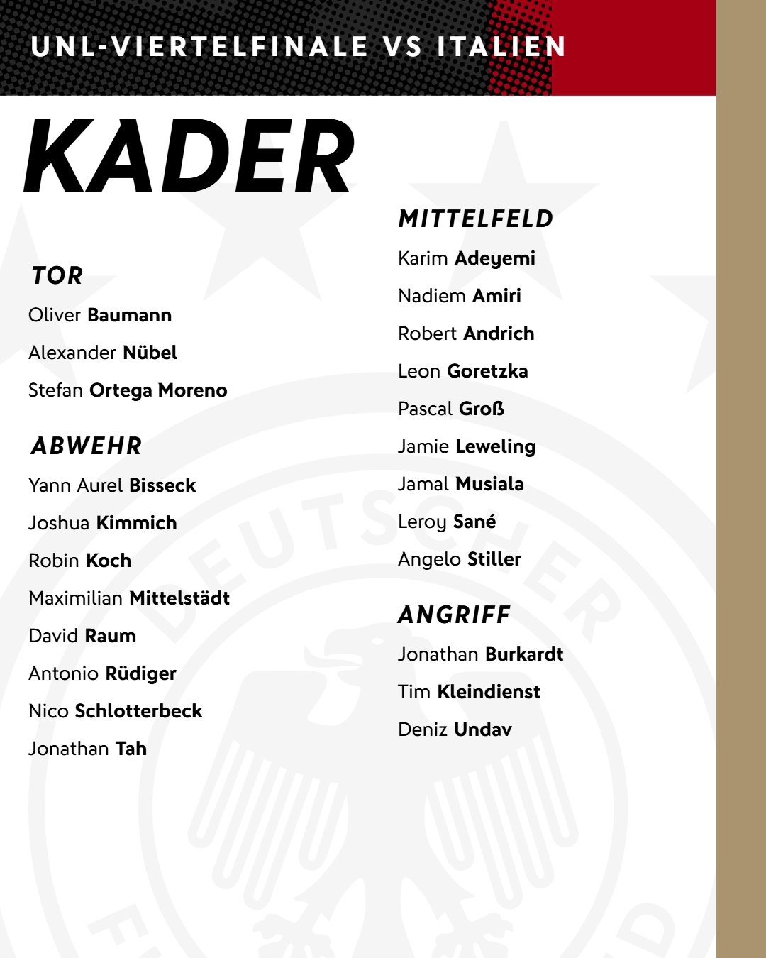 后衛(wèi):比塞克(國(guó)際米蘭)、基米希(拜仁)、科赫(法蘭克福)、米特爾施泰特(斯圖加特)、勞姆(RB萊比錫)、呂迪格(皇馬)、尼科-施洛特貝克(多特)、若納坦-塔(勒沃庫(kù)森)