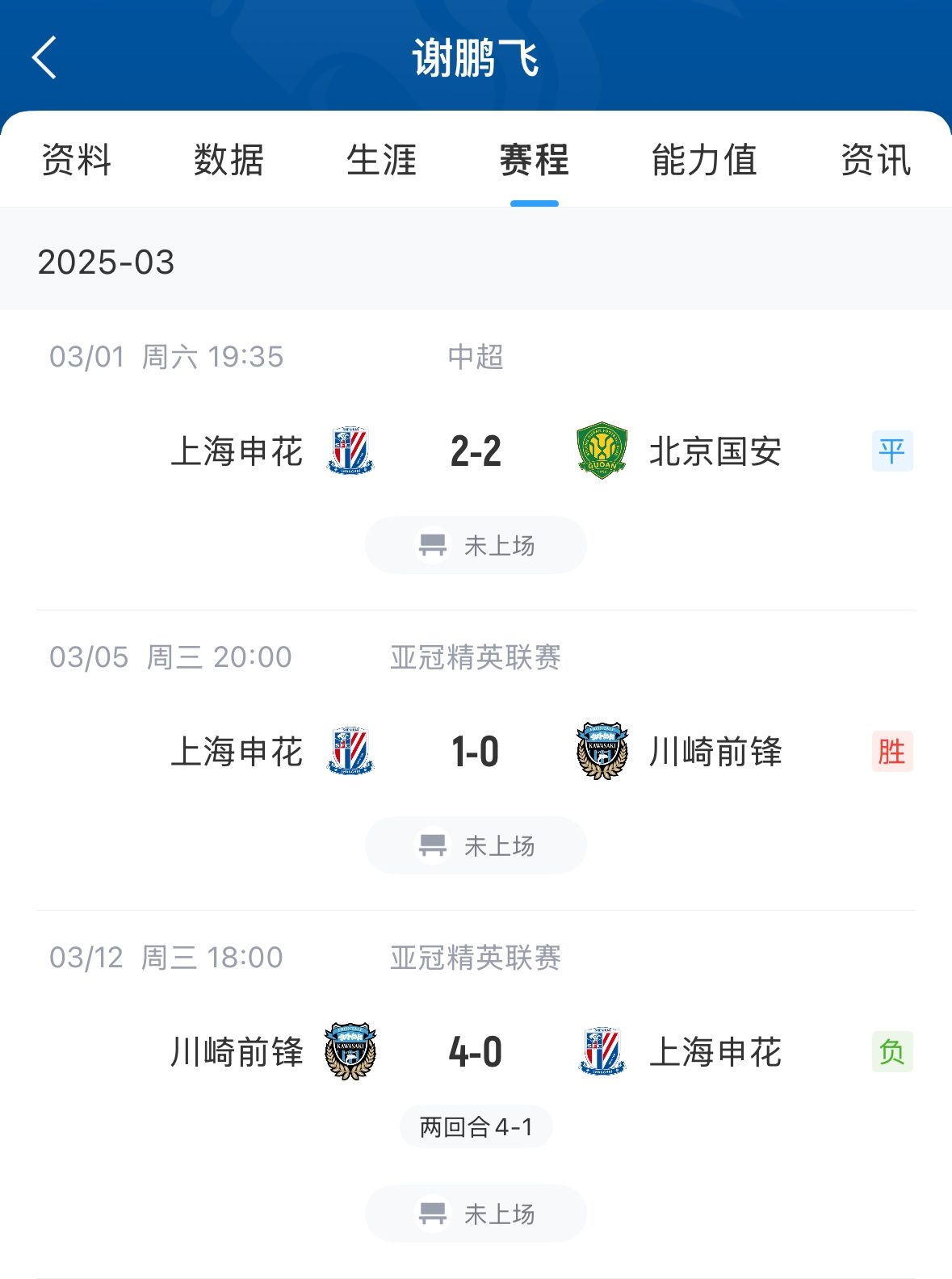 謝鵬飛本場比賽替補(bǔ)未出場,謝鵬飛今年6月底滿32歲,本賽季目前代表申花只出場1次出場時(shí)間26分鐘,其余幾場比賽均未出場。