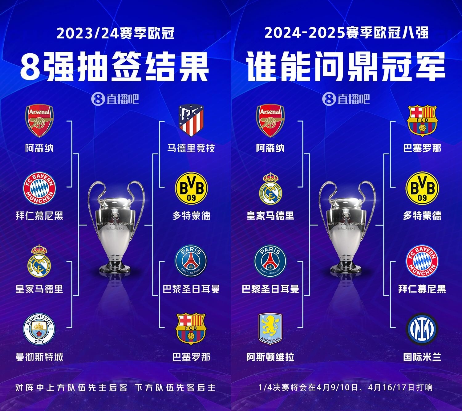 23/24賽季歐冠8強(qiáng):阿森納vs拜仁,皇馬vs曼城,馬競(jìng)vs多特,巴黎vs巴薩