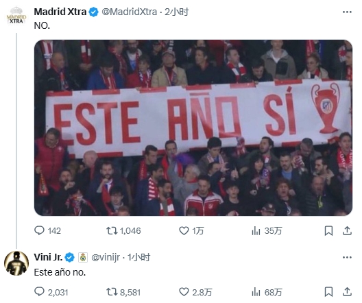 本場(chǎng)比賽馬競(jìng)球迷在看臺(tái)舉起橫幅:歐冠就今年了!皇馬的球迷號(hào)曬出橫幅并表示NO,維尼修斯社媒回復(fù)該球迷號(hào):今年,NO!