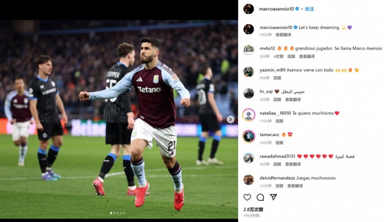 阿森西奧也在賽后曬出自己的慶祝照,并配文:“讓我們繼續(xù)保持夢想????????”。