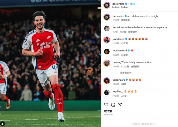 賴斯也在賽后通過(guò)社媒曬出自己進(jìn)球后的慶祝照,并調(diào)侃:“今晚沒(méi)有慶祝動(dòng)作的道德警察。”