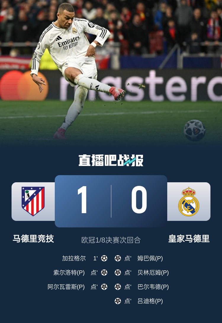 歐冠1/8決賽次回合,皇馬兩回合2-2,點球大戰(zhàn)4-2擊敗馬競晉級歐冠8強,將迎戰(zhàn)阿森納。上半場,加拉格爾閃擊破門,阿爾瓦雷斯兩次勁射被庫爾圖瓦撲出;下半場,姆巴佩造點,維尼修斯主罰打飛;加時賽,雙方均未制造破門良機;點球大戰(zhàn),阿爾瓦雷斯滑倒二次觸球進(jìn)球無效,巴斯克斯主罰被撲,略倫特?fù)糁袡M梁。