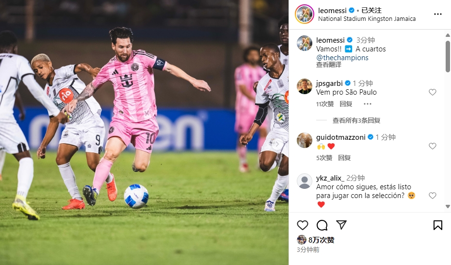 03月14日訊 中北美聯(lián)冠軍杯八分之一決賽次回合,梅西讀秒破門,邁阿密國際2-0卡瓦立爾。賽后梅西更新ins寫道:加油??!??進入1/4決賽!1/4決賽邁阿密國際將對陣洛杉磯FC。 標(biāo)簽: 足球 梅西 邁阿密國際