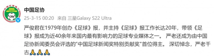 3月15日訊 《足球》報(bào)官方發(fā)布訃告,《足球》報(bào)創(chuàng)刊人嚴(yán)俊君因病離世,享年86歲。中國足協(xié)發(fā)文進(jìn)行悼念。