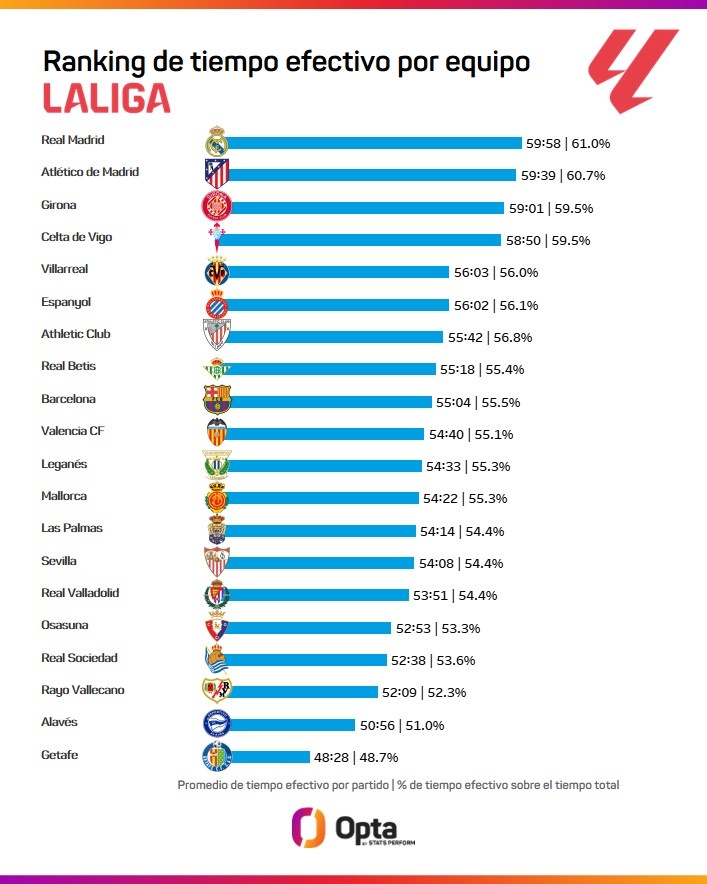 數(shù)據(jù)統(tǒng)計(jì)顯示,皇馬在本賽季西甲場(chǎng)均凈比賽時(shí)長(zhǎng)59:58是西甲最高,凈比賽時(shí)長(zhǎng)占比61.0%也是西甲最多。它的同城死敵馬競(jìng)則在這兩項(xiàng)數(shù)據(jù)均位列次席:場(chǎng)均凈比賽時(shí)長(zhǎng)59:39,占比60.7%。