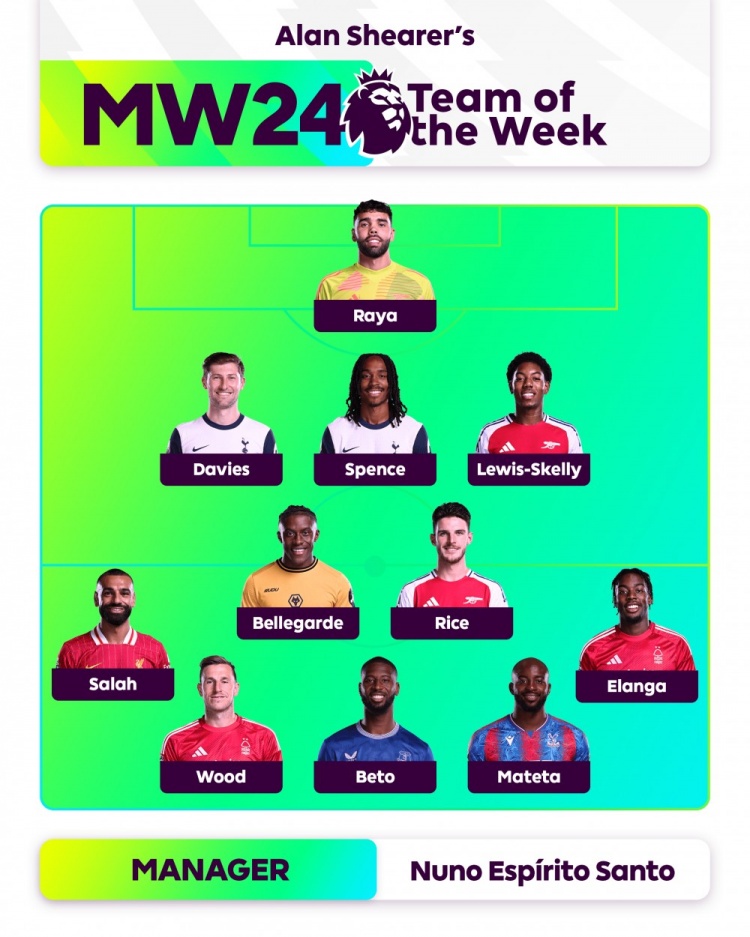 中場(chǎng):薩拉赫(利物浦)、貝萊加德(狼隊(duì))、賴(lài)斯(阿森納)、伊蘭加(森林)