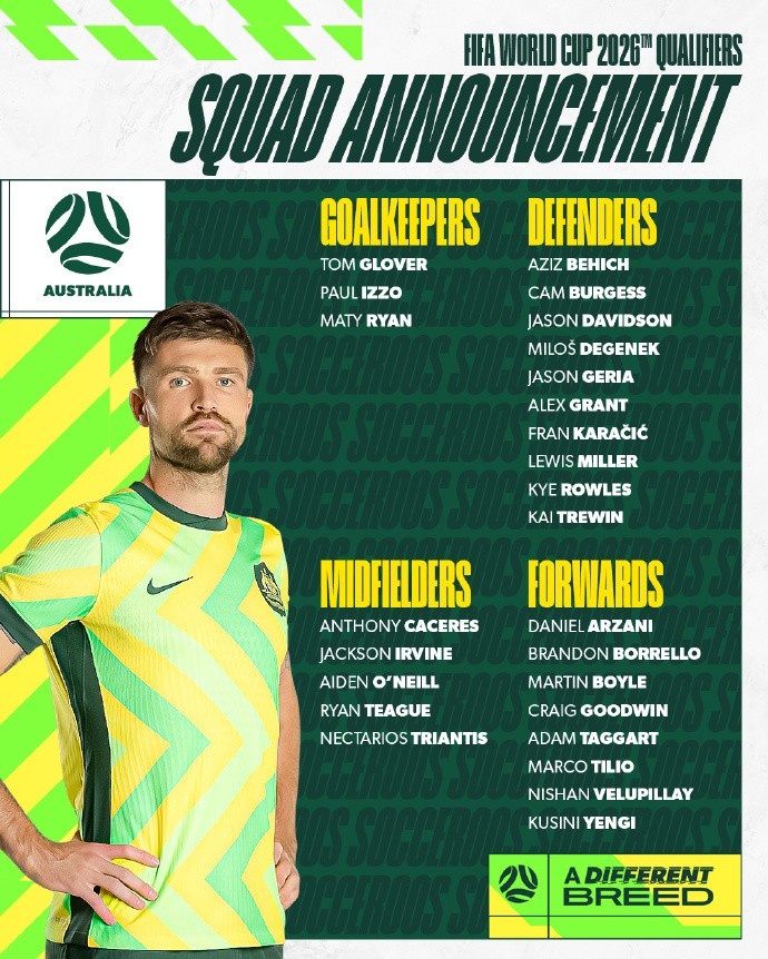 與去年11月的大名單相比,澳大利亞隊(duì)更換了12名球員,主因就是嚴(yán)重的傷病潮。至少有5名波波維奇時(shí)代的18強(qiáng)賽的主力缺席,包括后衛(wèi)齊卡蒂、蘇塔,中場博斯、麥克格林和前鋒杜克。波波維奇征召了4名從未入選過國家隊(duì)的新人以及兩位2022年后再未入選的“半新人”填坑。