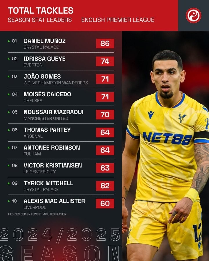 2月4日訊 squawka統(tǒng)計了本賽季英超球員搶斷情況,水晶宮的右后衛(wèi)穆尼奧斯獨自領跑。