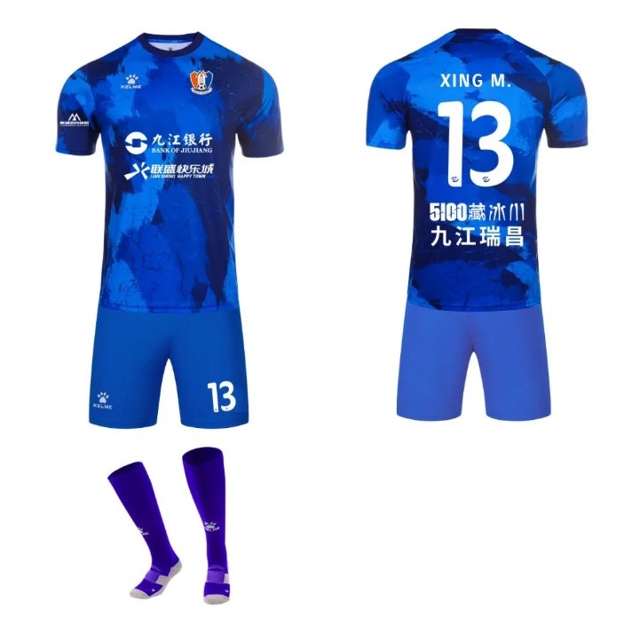 第一客場戰(zhàn)袍采用沉穩(wěn)大氣的深藍(lán)色,彰顯球隊(duì)沉穩(wěn)冷靜、從容不迫的氣質(zhì)。以浩瀚星空為靈感,將深邃的藍(lán)色作為主色調(diào),象征著江西廬山足球俱樂部胸懷遠(yuǎn)大理想,在綠茵場上追逐夢想,永不言棄的精神。