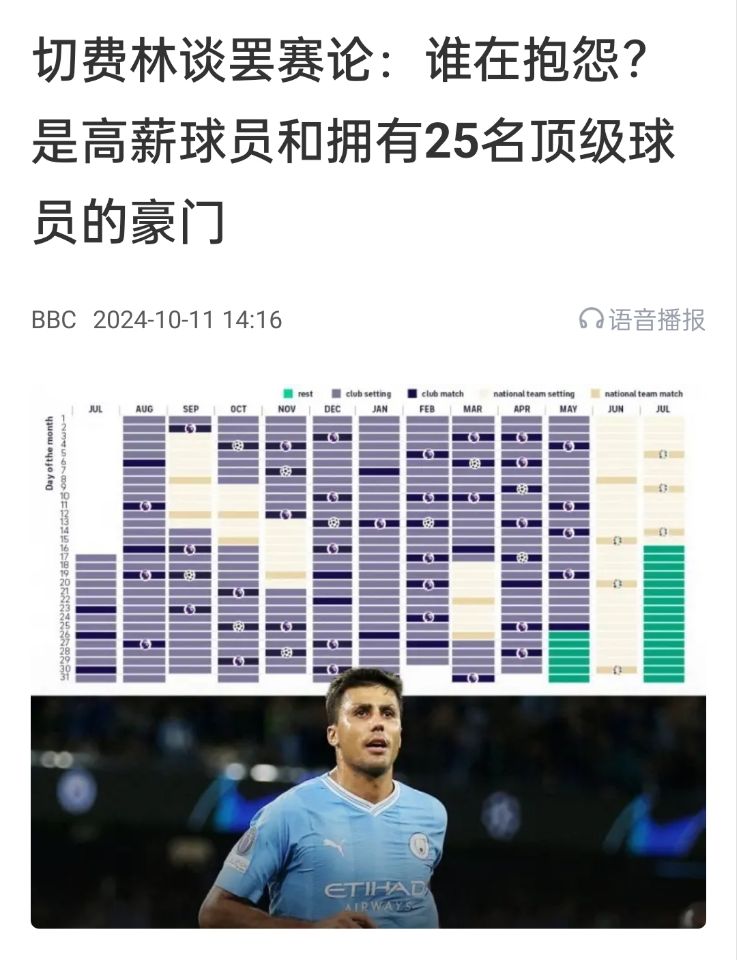 但對于這種抱怨,也存在相反的看法。比如歐足聯(lián)主席切費(fèi)林曾在采訪回應(yīng),抱怨賽程最多的就是那些大俱樂部和高薪球員。但他們?nèi)找媾蛎浀母咝角∏【托枰銟凡慷嗵弑荣悂碇巍H绻麄儾辉笢p薪,那賽程縮減也很難辦。