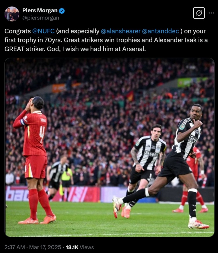 3月17日訊 本賽季聯(lián)賽杯決賽落幕,紐卡2-1擊敗利物浦捧杯,終結(jié)70年冠軍荒。賽后,知名槍迷、英國(guó)名嘴皮爾斯-摩根向紐卡送上祝賀。