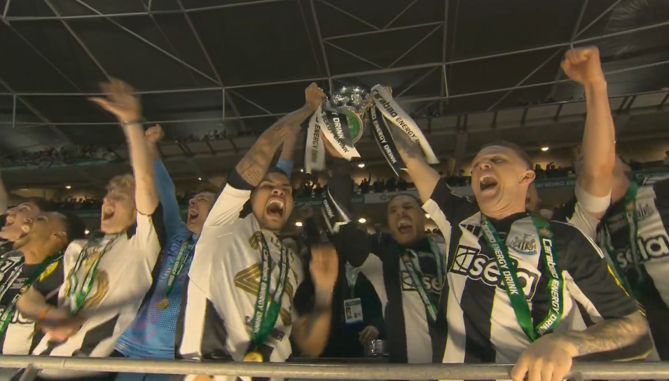 03月17日訊 紐卡擊敗利物浦奪得聯(lián)賽杯獎杯,終結(jié)隊史70年國內(nèi)頂級賽事冠軍荒。賽后頒獎儀式,特里皮爾和吉馬良斯捧起冠軍獎杯!47歲的埃迪-豪也來捧一下! 標簽: 足球 英超 紐卡斯爾聯(lián)