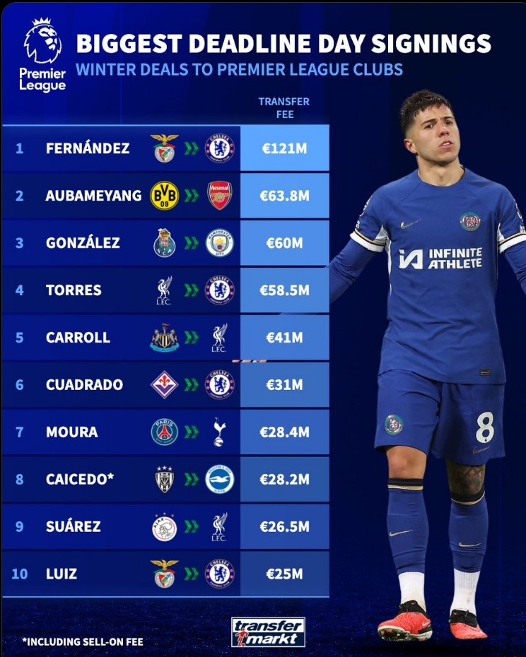 2月4日訊 在今年冬窗截止日,岡薩雷斯以6000萬歐加盟曼城,德轉(zhuǎn)也盤點(diǎn)了英超球隊歷史上在冬窗截止日最高轉(zhuǎn)會費(fèi)引援紀(jì)錄榜,以下為具體情況: