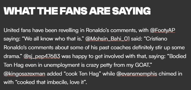 2月4日訊 此前C羅在接受六臺(tái)記者阿吉雷專訪時(shí)表示,自己曾共事過“非常糟糕、完全不懂球”的教練。國外球迷對(duì)此展開熱議稱,C羅所指的就是前曼聯(lián)主帥滕哈赫。