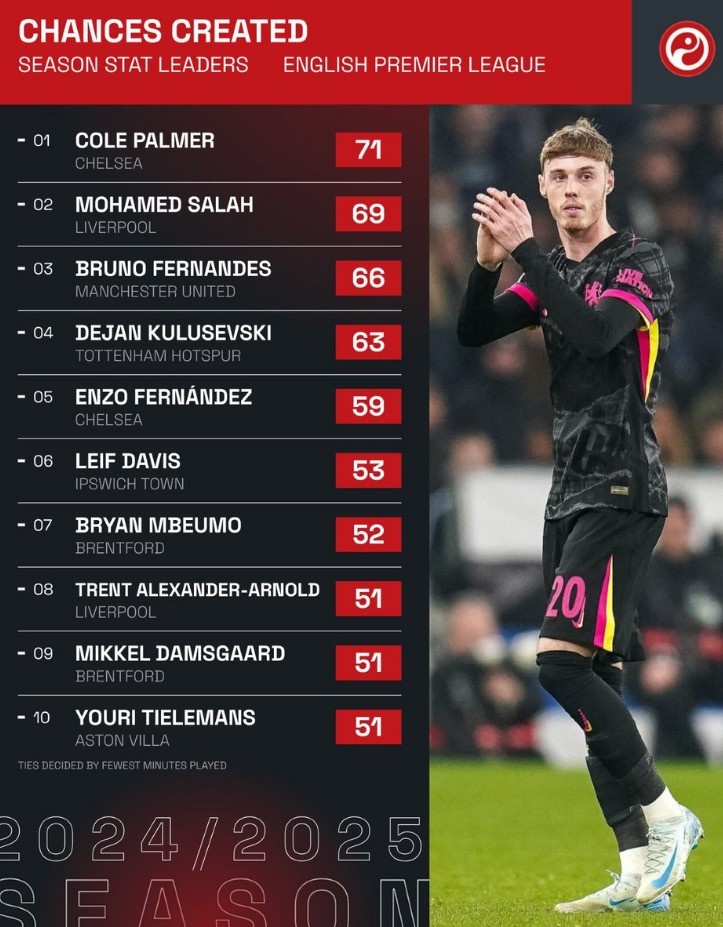3月17日訊 數(shù)據(jù)網(wǎng)站Squawka盤點(diǎn)了本賽季英超創(chuàng)造機(jī)會(huì)榜,其中帕爾默以71次居首,不過(guò)他自去年12月對(duì)陣維拉之后還沒(méi)有送出過(guò)助攻。具體創(chuàng)造機(jī)會(huì)榜如下: