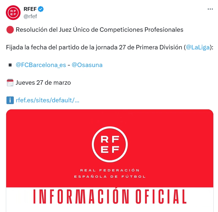 通知對(duì)象: 巴薩、奧薩蘇納、LNFP、裁判委員會(huì)、RFEF競(jìng)賽部門。