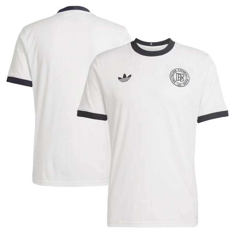 紀(jì)念球衣的設(shè)計(jì)以1974年復(fù)古球衣為藍(lán)本——這一年,德國(guó)男足國(guó)家隊(duì)在本土贏得了世界杯冠軍。125周年紀(jì)念球衣的配色和剪裁均承載著德國(guó)足協(xié)的歷史:球員版球衣采用經(jīng)典的黑白配色,而守門(mén)員球衣則為淡藍(lán)色。球衣采用細(xì)條紋面料,搭配袖口、圓領(lǐng)衣領(lǐng)以及衣領(lǐng)后方的旗幟印花。球衣胸前繡有阿迪達(dá)斯的三葉草標(biāo)志,以及特別為德國(guó)足協(xié)成立125周年設(shè)計(jì)的刺繡徽章,而該徽章的涉及靈感來(lái)自德國(guó)足協(xié)在萊比錫成立地所懸掛的紀(jì)念牌匾。