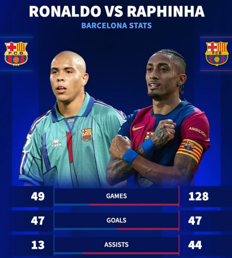 而他也已經(jīng)追平了羅納爾多在巴薩的進(jìn)球數(shù),大羅為巴薩共計(jì)僅出戰(zhàn)49場比賽,貢獻(xiàn)了47球13助攻。
