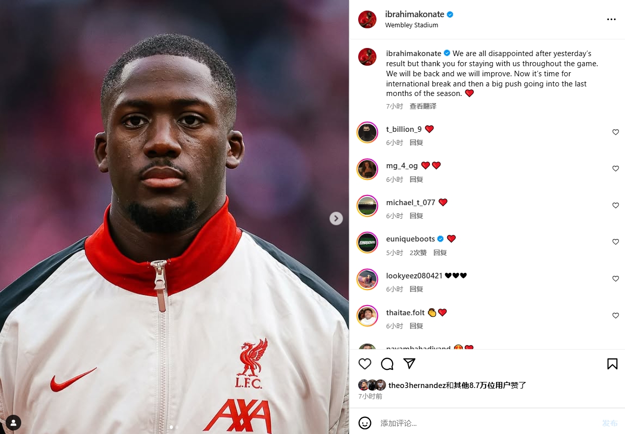 利物浦中衛(wèi)科納特在社交媒體上寫道:“昨天的比賽結(jié)果讓我們都很失望,但感謝大家整場(chǎng)比賽都與我們同在。”