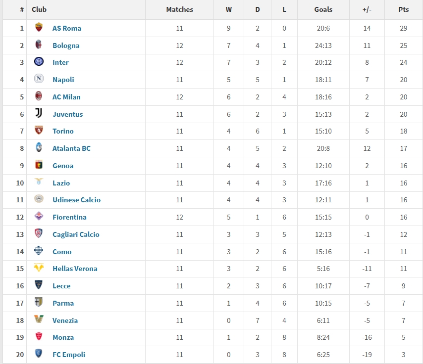 排在次席的是博洛尼亞(25分),第三是國米(24分),而那不勒斯、米蘭以及尤文圖斯均拿到了20分,位列4-6名。