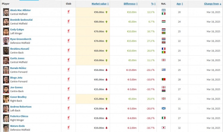 3月18日訊 德轉(zhuǎn)更新了部分英超球員身價(jià),在此次更新中有13位利物浦球員身價(jià)發(fā)生了變化,其中6人出現(xiàn)下跌,7人出現(xiàn)上漲。