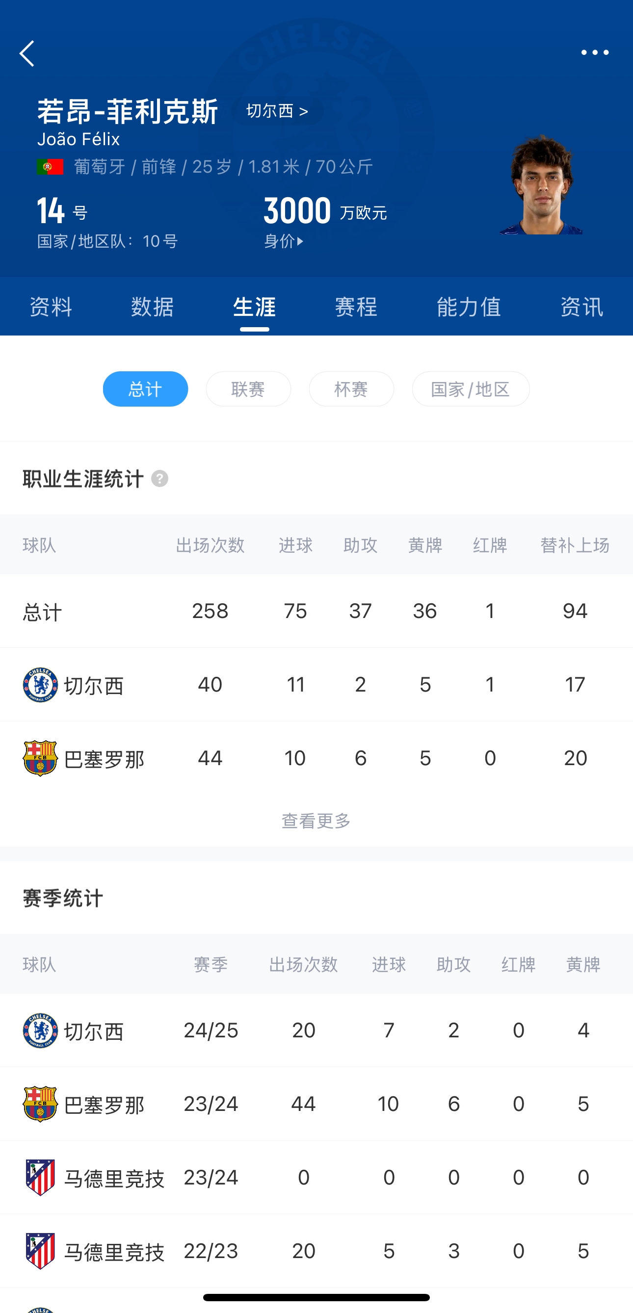 菲利克斯,現(xiàn)年25歲,葡萄牙前鋒,去年夏窗切爾西花費(fèi)5200萬歐從馬競簽下球員,本賽季菲利克斯共代表切爾西出戰(zhàn)20場比賽,貢獻(xiàn)7球2助,目前球員德轉(zhuǎn)身價(jià)3000萬歐。