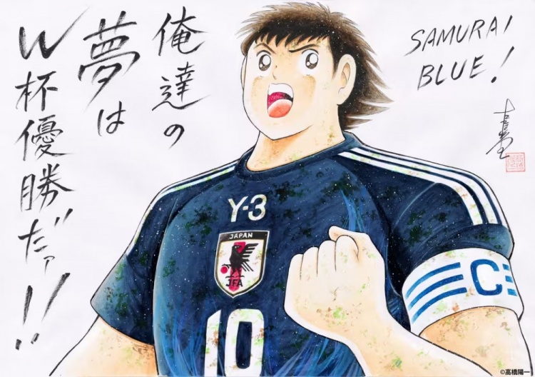 這是高橋陽一在3月世預賽期間特意為日本隊設計的應援插畫,插畫上是大空翼穿著日本國家隊球衣用力握拳的模樣,并寫著:“我們的夢想是世界杯冠軍??!”