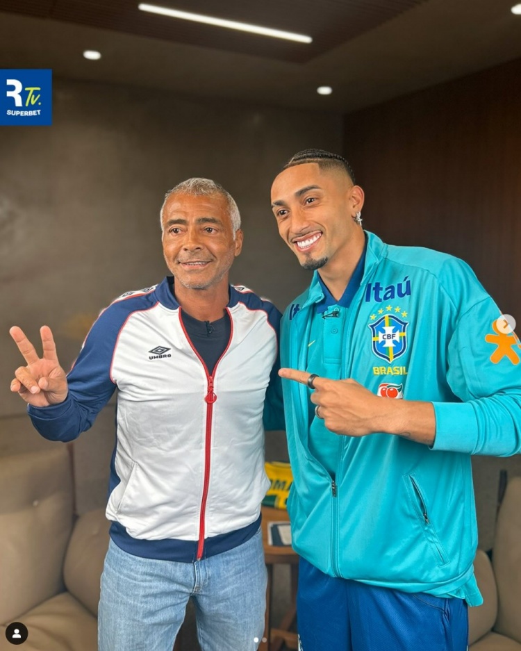 3月19日訊 巴西國(guó)家隊(duì)已經(jīng)集結(jié)備戰(zhàn)新一輪南美世預(yù)賽,羅德里戈、拉菲尼亞以及恩德里克三人做客Roma?rioTV節(jié)目,與巴西傳奇球星羅馬里奧合影留念。