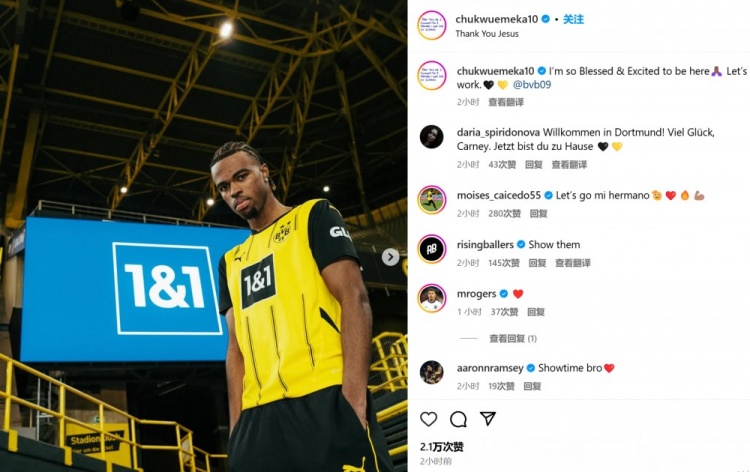 楚克烏梅卡通過社媒曬出自己身穿多特球衣現(xiàn)身威斯特法倫球場(chǎng)的照片,并表示:“能夠來到這里,我感到非常榮幸與激動(dòng)。讓我們開始努力吧!@多特蒙德俱樂部?!?/p>