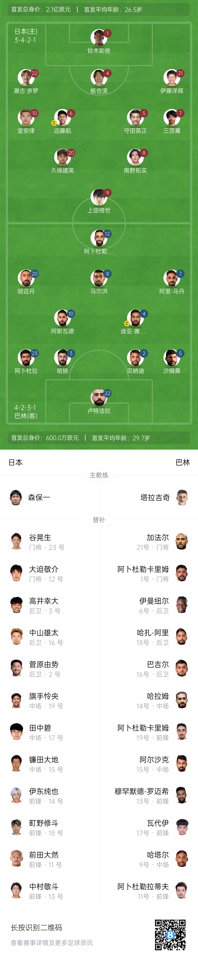 03月20日訊 北京時(shí)間18點(diǎn)35分,世預(yù)賽亞洲區(qū)第三階段C組第7輪,日本vs巴林,賽前雙方首發(fā)公布!本場比賽日本隊(duì)贏球即可提前晉級2026世界杯。