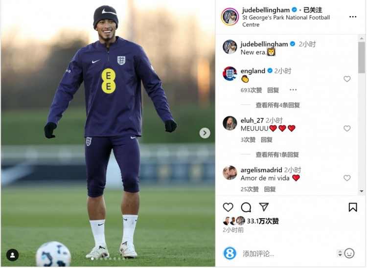 貝林厄姆隨英格蘭隊備戰(zhàn)世預賽,他在社交媒體上曬出訓練照片,并配文:“新時代????”