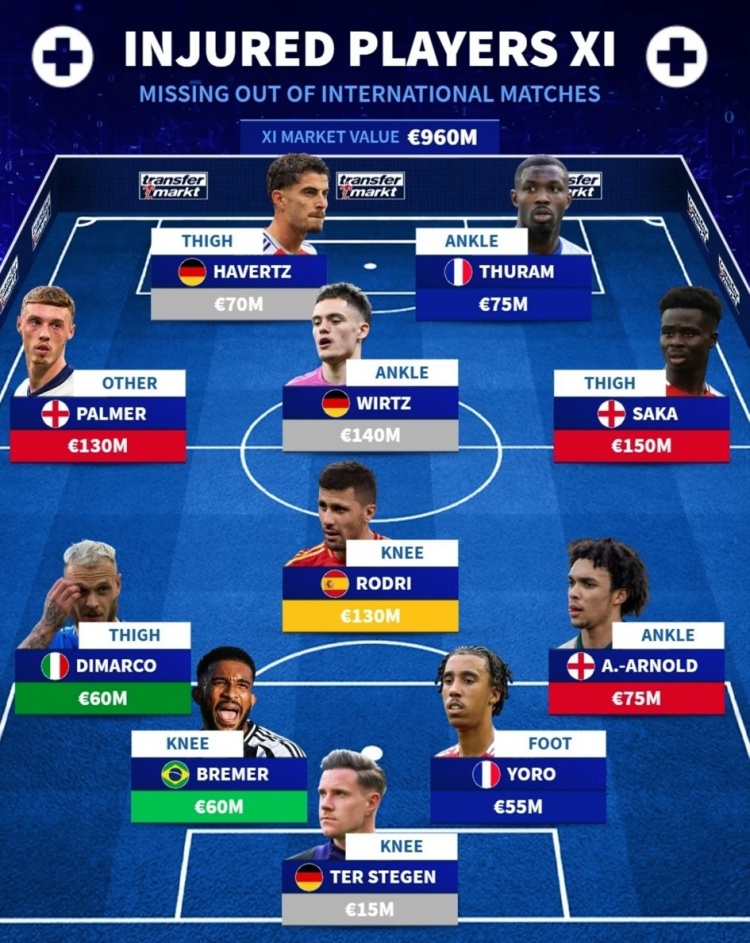 3月20日訊 德國轉會市場列出了因傷缺席國家隊比賽的球員陣容,薩卡、帕爾默、維爾茨、羅德里、阿諾德在列。
