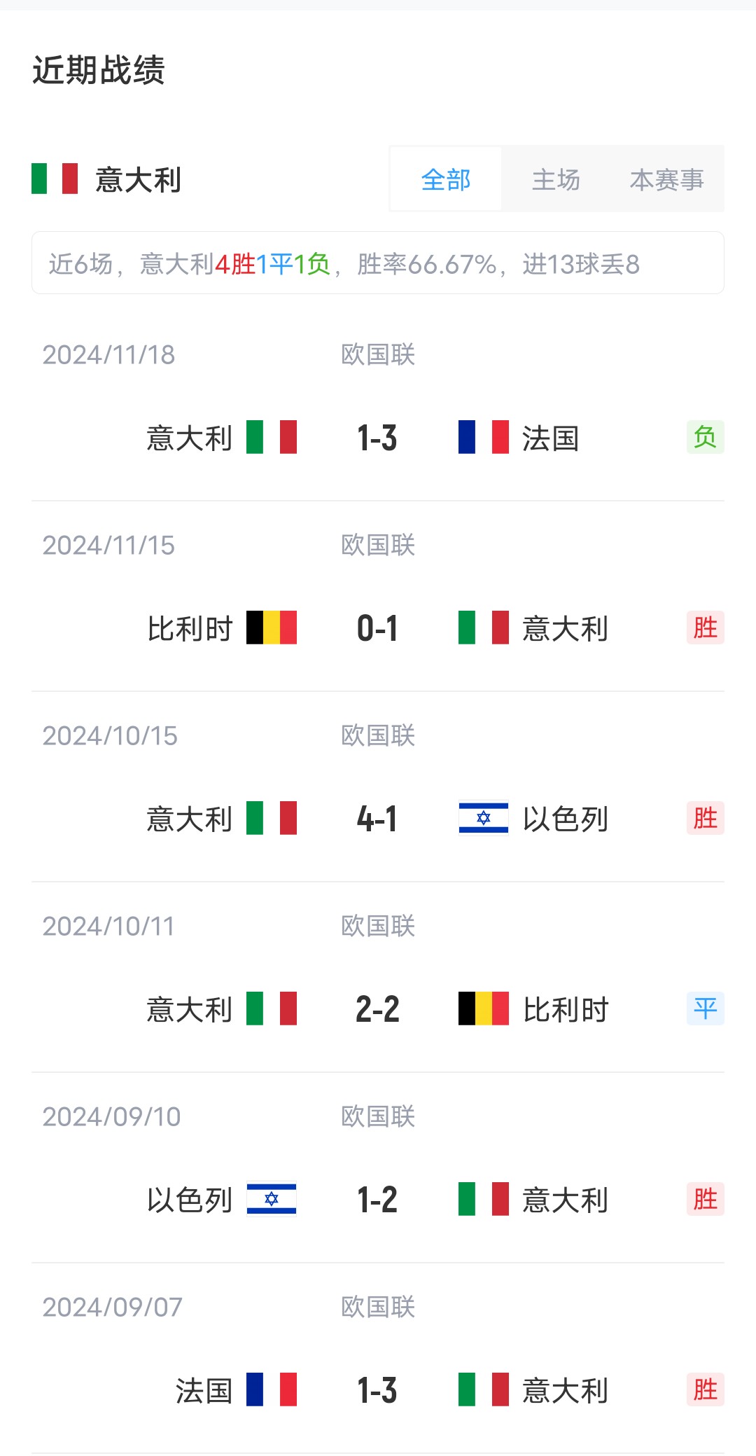 在歐國聯(lián)小組賽中,意大利排名B組第2,德國排名C組第1;雙方近6場直接對話中,意大利取得了1勝4平1負(fù)的戰(zhàn)績。兩隊(duì)最近一次交手,是在2016年11月16日,友誼賽意大利0-0戰(zhàn)平德國。
