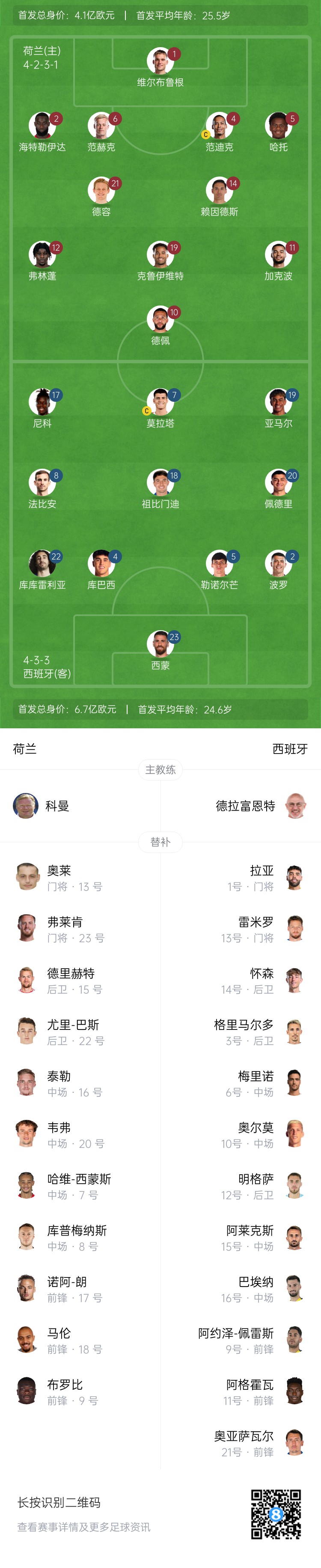 3月21日訊 北京時間03:45,歐國聯(lián)1/4賽決賽首回合,荷蘭主場迎戰(zhàn)西班牙。賽前官方公布了雙方的首發(fā)名單。