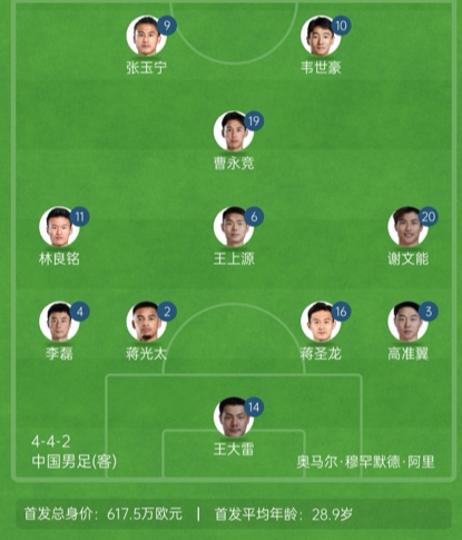 國足官方陣型442菱形中場:王上源單后腰,張玉寧、林良銘雙前鋒