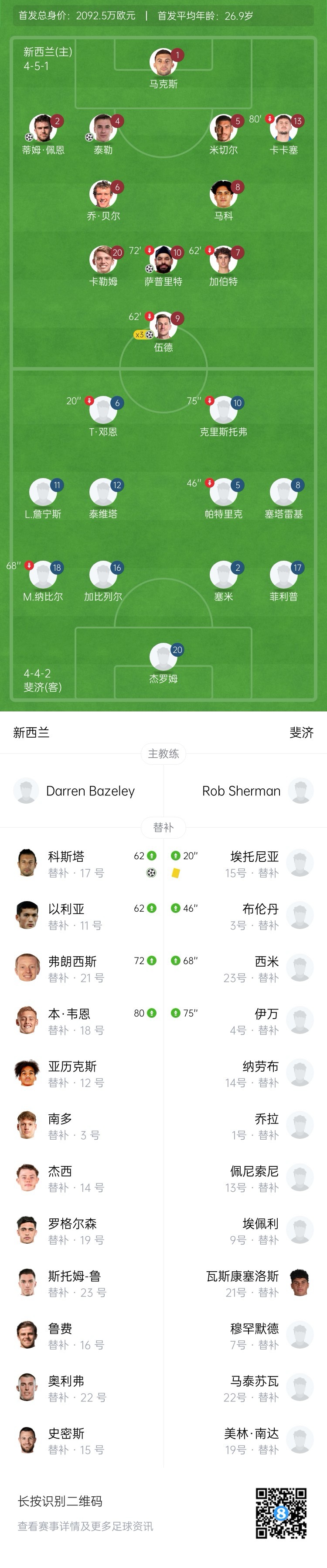 新西蘭目前FIFA排名第89名,比中國(guó)隊(duì)高一名(中國(guó)FIFA第90),新西蘭陣中頭號(hào)前鋒是效力于諾丁漢森林的伍德,身價(jià)1000萬(wàn)歐。
