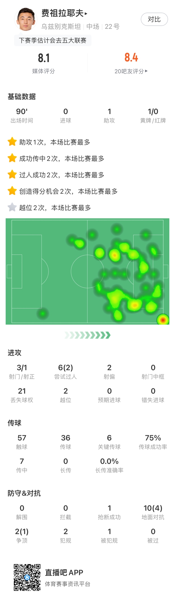 烏茲別克斯坦1-0吉爾吉斯斯坦,距離世界杯越來越近,21歲中場費祖拉耶夫1v6挑傳助攻。費祖拉耶夫目前21歲,效力俄超莫斯科中央陸軍,身價800萬歐,下一站會是五大聯(lián)賽嗎? 標簽: 足球 國家隊 五洲