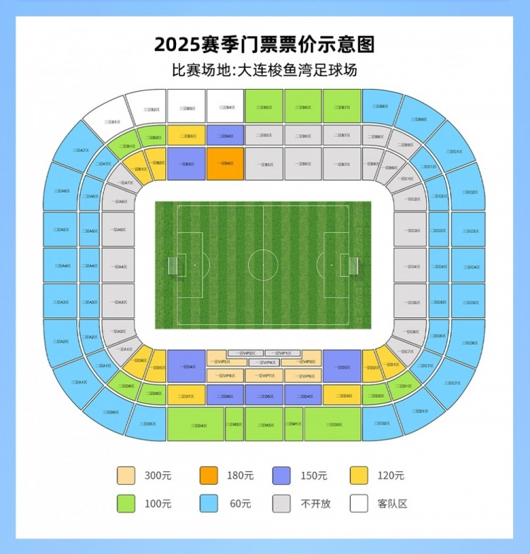本賽季,大連英博的主場(chǎng)仍是梭魚(yú)灣足球場(chǎng)。俱樂(lè)部將主場(chǎng)看臺(tái)散票劃分為6個(gè)區(qū)域,每個(gè)區(qū)域票價(jià)不同,分別為60元、100元、120元、150元、180元和300元。