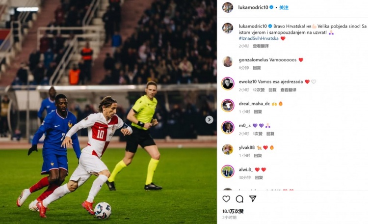 3月22日訊 克羅地亞在歐國聯(lián)八強(qiáng)戰(zhàn)首回合主場(chǎng)2-0擊敗法國,隊(duì)長(zhǎng)莫德里奇在賽后通過社媒慶祝勝利。