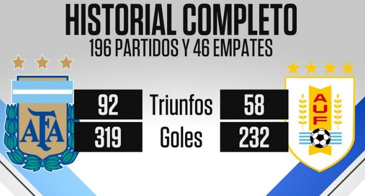 據(jù)統(tǒng)計,這是阿根廷與烏拉圭兩支南美老牌強(qiáng)隊歷史上第196次交鋒,阿根廷的戰(zhàn)績?yōu)?2勝46平58負(fù),打進(jìn)319球,丟232球。
