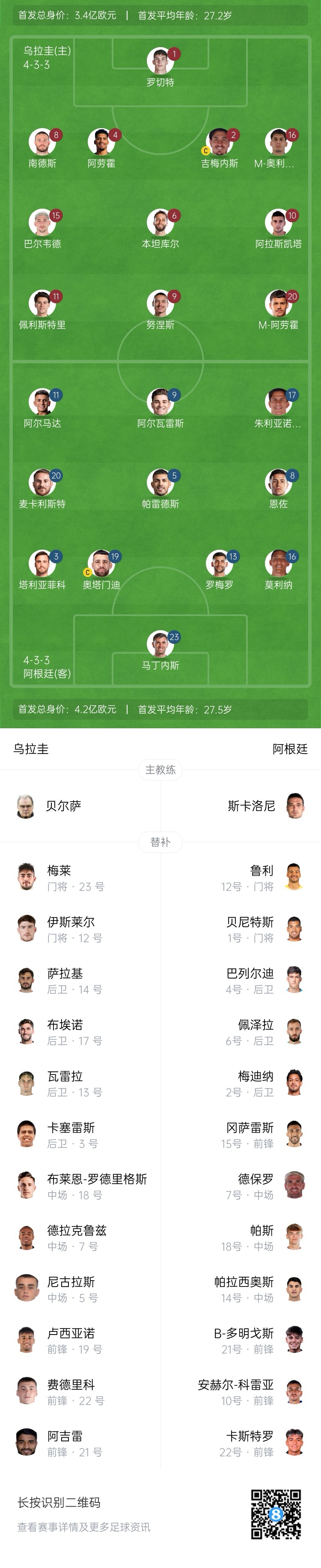 阿根廷首發(fā):23-馬丁內斯、16-莫利納、13-羅梅羅、19-奧塔門迪、3-塔利亞菲科、8-恩佐、5-帕雷德斯、20-麥卡利斯特、17-朱利亞諾-西蒙尼、11-阿爾馬達、9-阿爾瓦雷斯