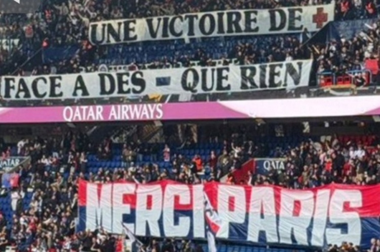 巴黎在今日主場(chǎng)1-0擊敗朗斯,但巴黎球迷們依然陶醉在上一輪痛擊馬賽的歡樂中,并拉出橫幅嘲諷道:“又一次擊敗了那幫一無是處的人。謝謝巴黎。”