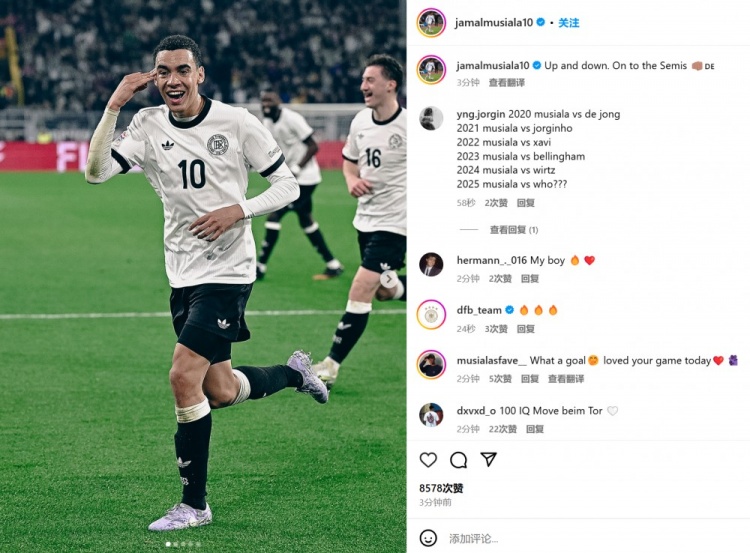 3月24日訊 德國(guó)在歐國(guó)聯(lián)八強(qiáng)戰(zhàn)次回合3-3戰(zhàn)平意大利,總比分5-4晉級(jí),穆西亞拉取得進(jìn)球。