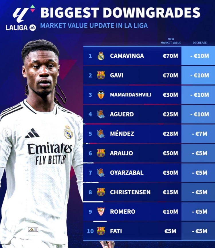 德轉列西甲身價貶值榜:歐元