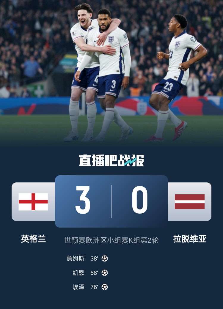 里斯-詹姆斯精彩任意球破門,賴斯助攻凱恩破門,埃澤單兵爆破建功。最終,英格蘭3-0戰(zhàn)勝拉脫維亞,世預賽2連勝暫3分領跑K組。