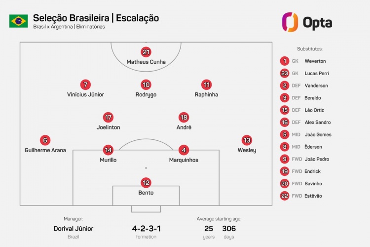 巴西公布了此役的首發(fā)陣容,Opta指出,巴西隊先發(fā)陣容中超過一半的球員在國家隊的首發(fā)次數(shù)不超過5次,分別是安德烈(5)、庫尼亞(3)、本托(2)、喬林頓(2)、穆里略(0)、韋斯利(0)。