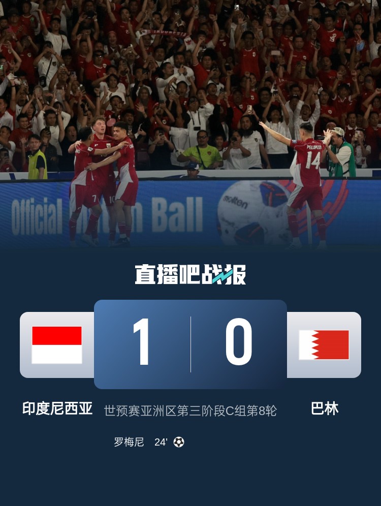 世預賽亞洲區(qū)第三階段C組第8輪,羅梅尼單刀破門,印度尼西亞1-0巴林。印尼此役后領(lǐng)先國足3分。