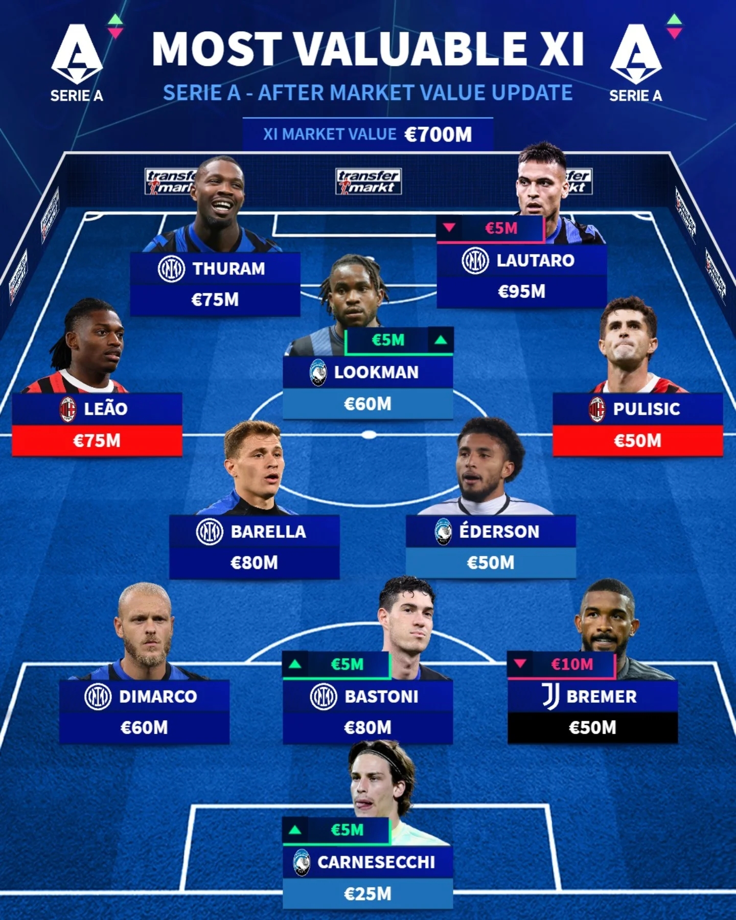 中場:巴雷拉(國米,8000萬歐)、埃德森(亞特蘭大,5000萬歐)、萊奧(米蘭,7500萬歐)、普利西奇(米蘭,5000萬歐)、盧克曼(亞特蘭大,6000萬歐,本次+500萬歐)