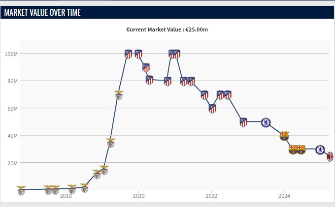 菲利克斯2500萬歐的身價(jià)也是2019年之后的新低,菲利克斯2019年巔峰身價(jià)曾達(dá)1億歐,在2021年之后身價(jià)一直在下降。